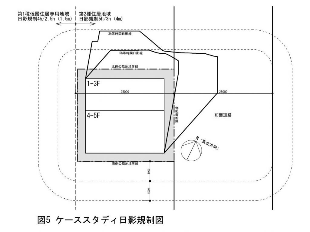 この敷地における高度地区の検討は以上です。しかし、高度地区の指定がある場合は、同時に日影規制も指定されていることが多く、合わせて検討が必要です。図2を見直してみると、敷地には「5h/3h(略記号は5-3/4m)」の日影規制が指定されており、さらに環7から25m以降は「4h/2.5h(略記号は4-2.5/1.5m)」と、さらに厳しい日影規制が指定されています。これらの日影規制を検討してみると、同じ平面形状のままであれば、実はこの敷地では、図5のように5階建てまでしか建てることができません。