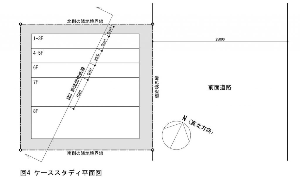 これを平面図に示したものが図4です。先ほどの図3は、図4中央に書かれた切断位置で真北方向に切った断面図になります。