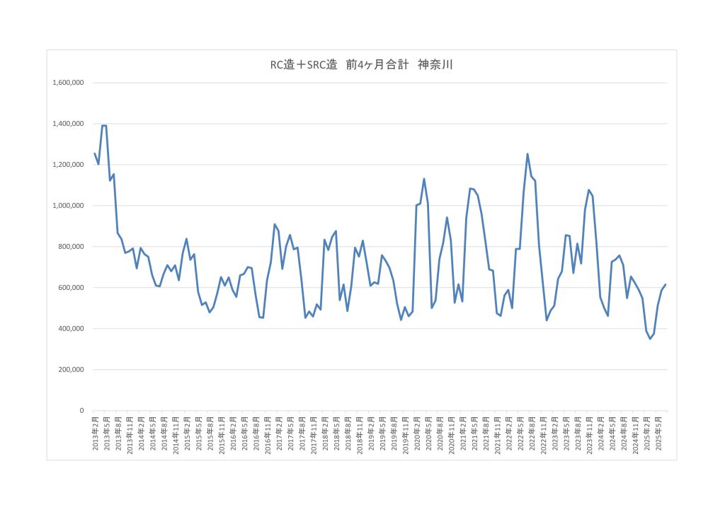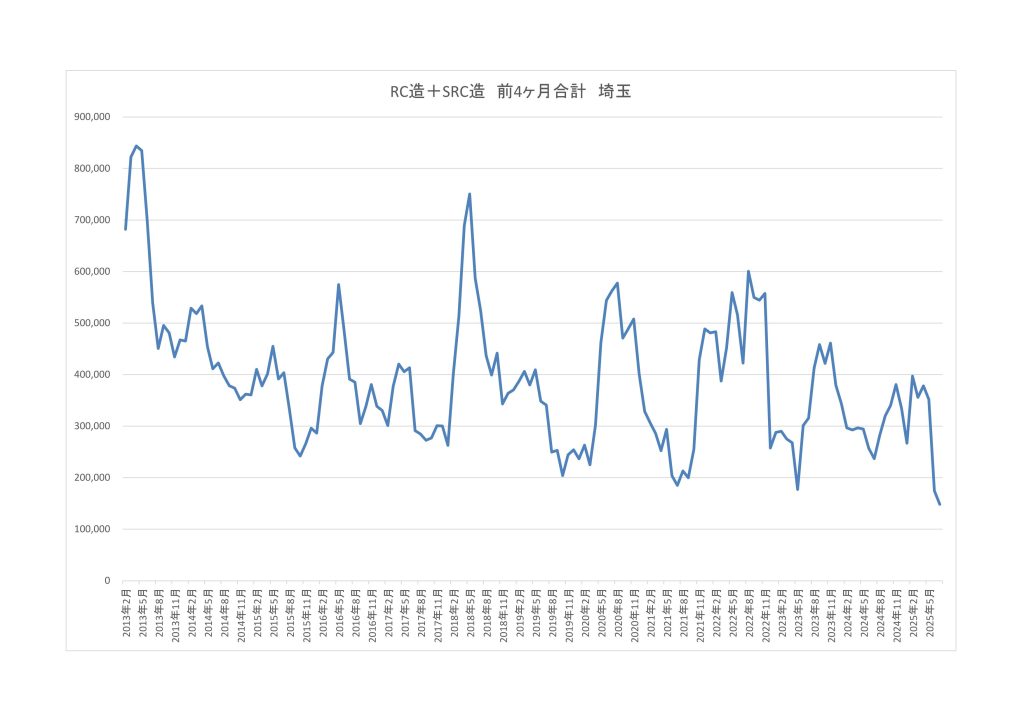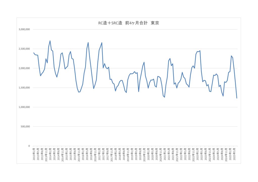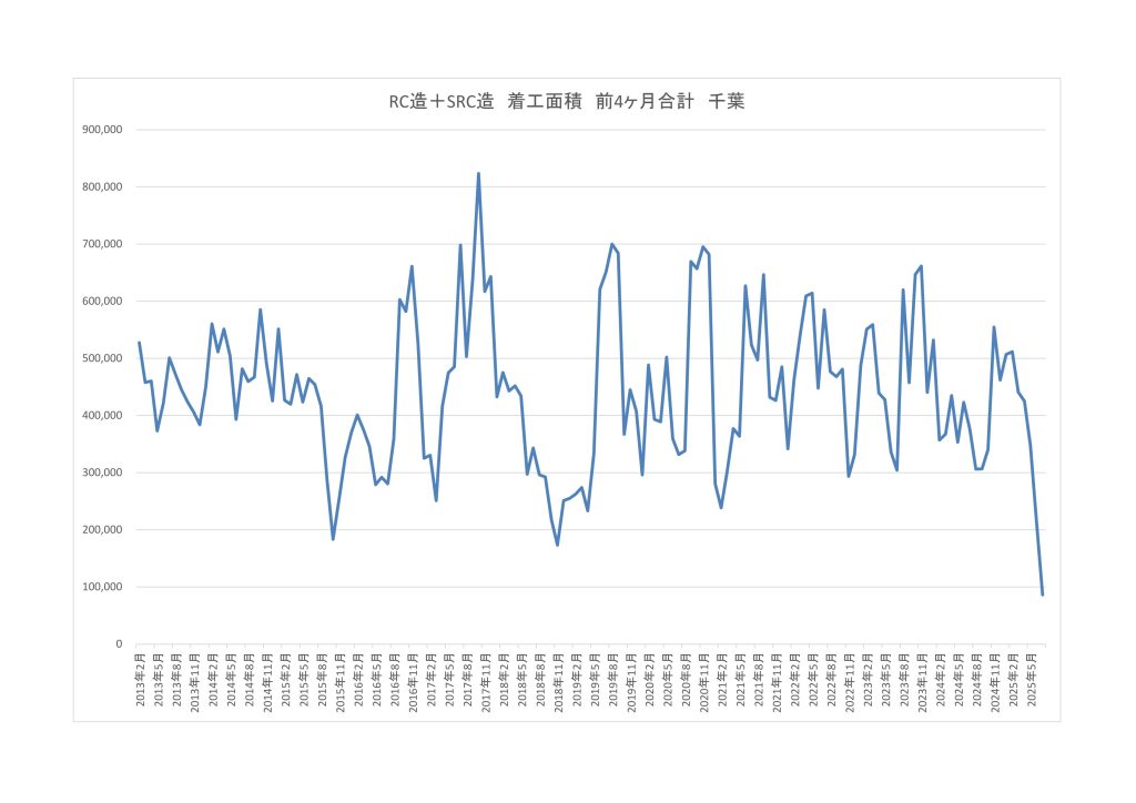 ここ1年近く、首都圏RC系で、900万㎡~870万㎡の着工面積で、今の状態ですから、年間着工面積が850万㎡を下回ることになると、