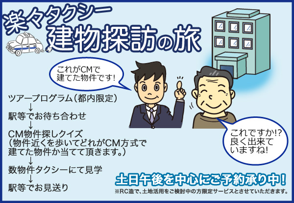その検証の間に、何処かのタイミングで当社で扱った物件を私の車や、タクシーで案内する「楽々タクシー建物探訪の旅」に、ご案内したり、完成間際の物件の中が見れるタイミングが有れば、ご覧になって頂いたり、熱心なお客様は、当社のセミナーに改めて参加して頂いたり、様々なことから理解を深めて頂きます。