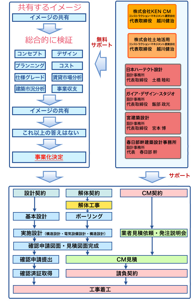 事業化決定後は、当社は、CM業務契約契約書を、設計事務所は設計契約を締結して頂きます。